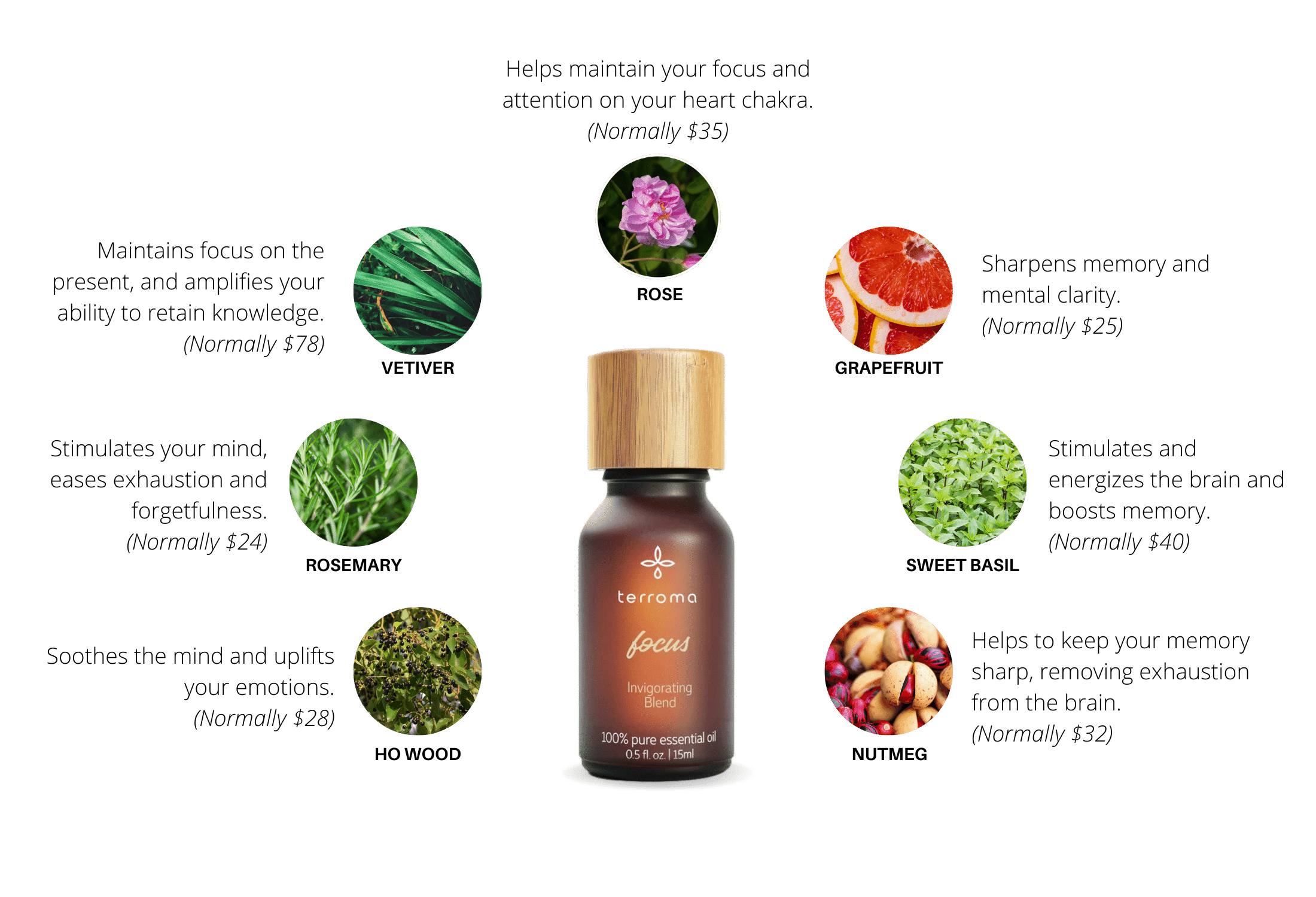 After just a few minutes of diffusing Focus™ in your environment, you will begin to feel the effects of each essential oil.